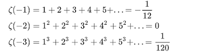 這series在s大於1 的實數時,我們直接可計算出數目。我們可用complex analysis中的Analytic continuation (解析延拓)把這function定義到整個複數空間。如以這定義下,我們可得出一些奇怪(不配合直觀)但合理(配合定義,不有矛盾)的結果: